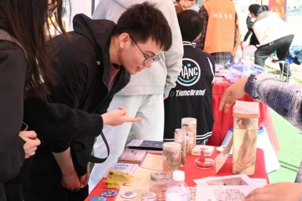 我校张瑜服务队与蓝色精灵服务队分别以特色展位呈现服务成果。张瑜服务队通过儿童手写信笺、干花艺术装置等,系统呈现其对接玫瑰湾社区开展的儿童关怀项目;蓝色精灵志愿服务队则以水生生物标本展示生态保护,配套设计互动问答程序。两团队现场互赠徽章,共享展区照片,形成学科交叉的展陈矩阵。 活动现场互动频繁,气氛热烈。"姐姐,这朵紫色的花叫什么名字?"一位小学生好奇地询问张瑜服务队的志愿者。"这个是蓝环章鱼的标本吗?为什么蓝环没有网上看起来那么吓人?"参观者在蓝色精灵志愿服务队展台前提出各种问题。志愿者们耐心解答,现场洋溢着浓厚的科普氛围。